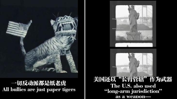 Özgürlük Heykeli’nin görüntülerinin de yer aldığı propaganda klibinde, iki ülke arasındaki gümrük vergisi savaşı fırtınanın gözü olan “ölümcül tuzağa” benzetiliyor ve “ABD’nin tüm dünyayı temsil etmediği” savunuluyor.