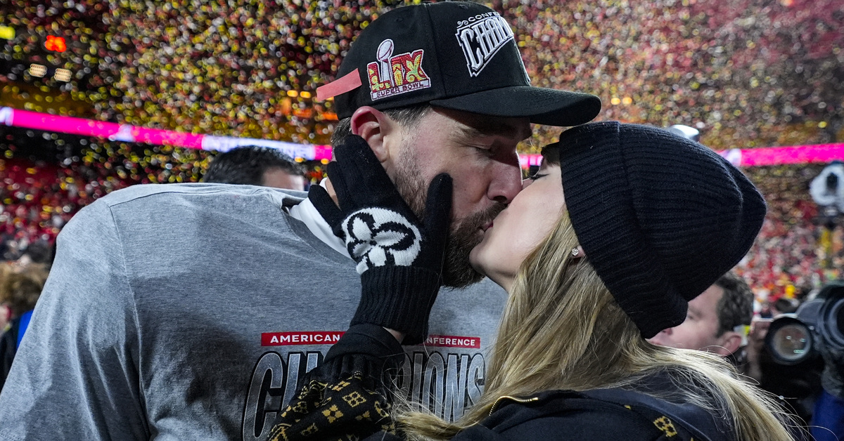 Travis Kelce, takımı Chiefs’in dünkü galibiyeti sonrası, büyük final maçı 2025 Super Bowl’a bilet almasını, Taylor Swift ile öpüşerek kutladı.
